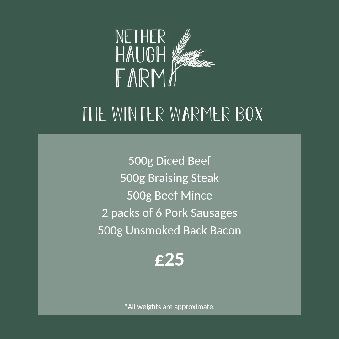 Box contains: 1 xĀ 500g Diced Beef, 1 x 500g Braising Steak, 1 x 500g Beef Mince, 2 x 6 Pork Sausages, 1 x 500g Unsmoked Back Bacon