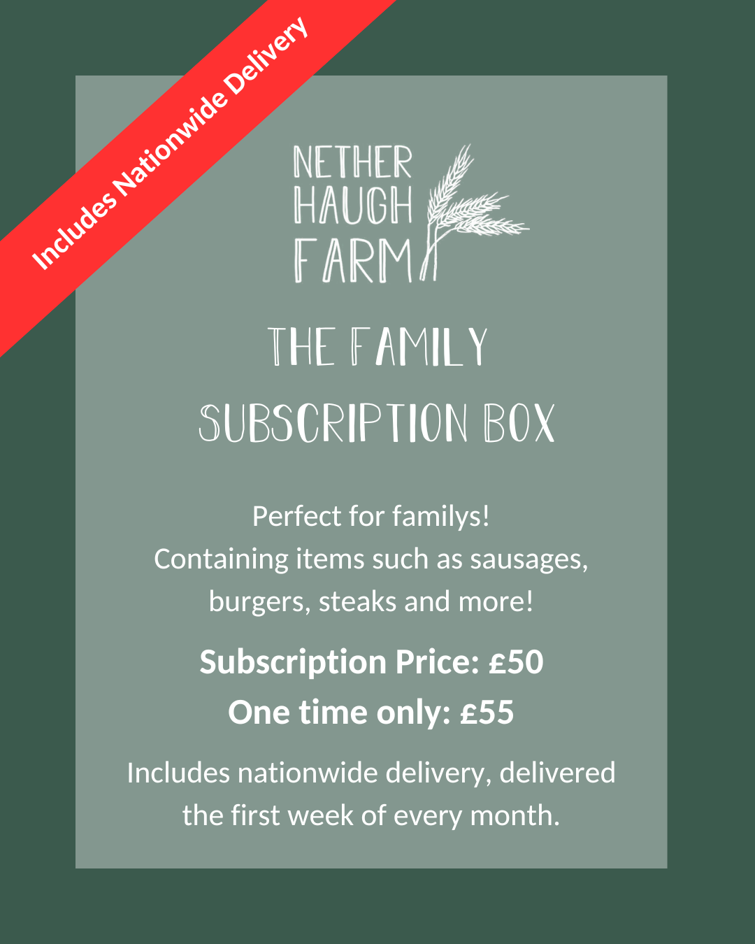 Simplify your meal planning with our "Family" Meat Subscription Box, delivered straight to your door in the first week of every month. This convenient subscription includes all your essential meats like mince, sausages, burgers, along with specials such as steaks and joints.